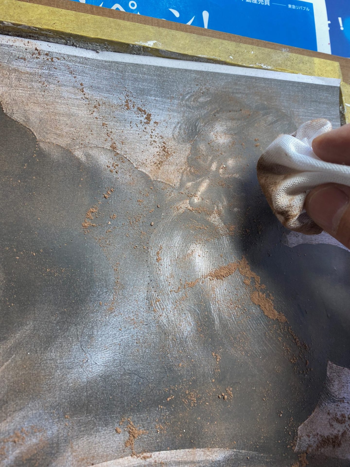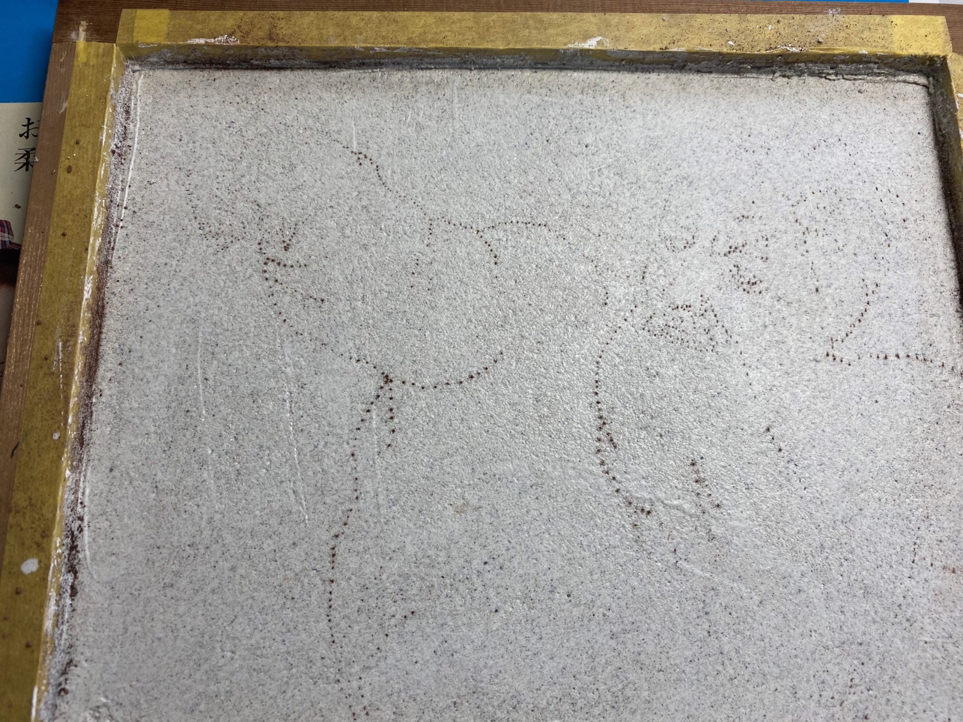 6.Cartòneを画面に当てて、顔料をその穴に刷り込む。