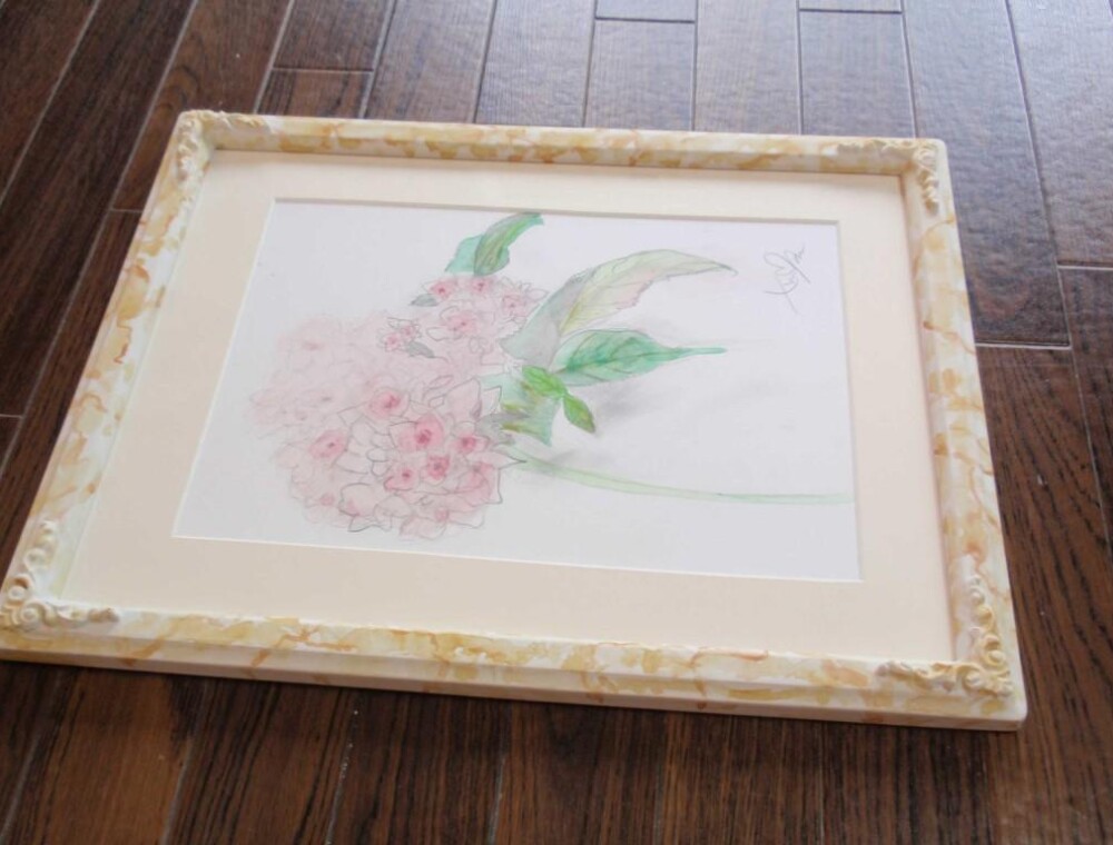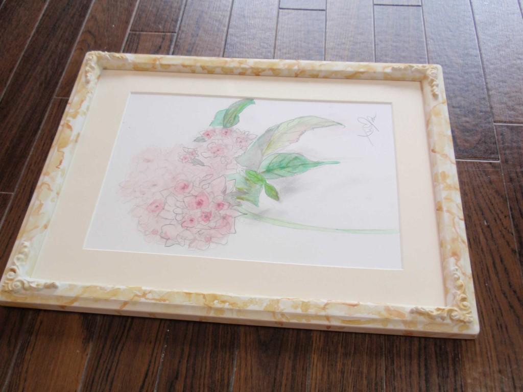 その時の完成作はこちらです。マットから額縁作りまで頑張りました。但し水彩画は別の教室での制作です。