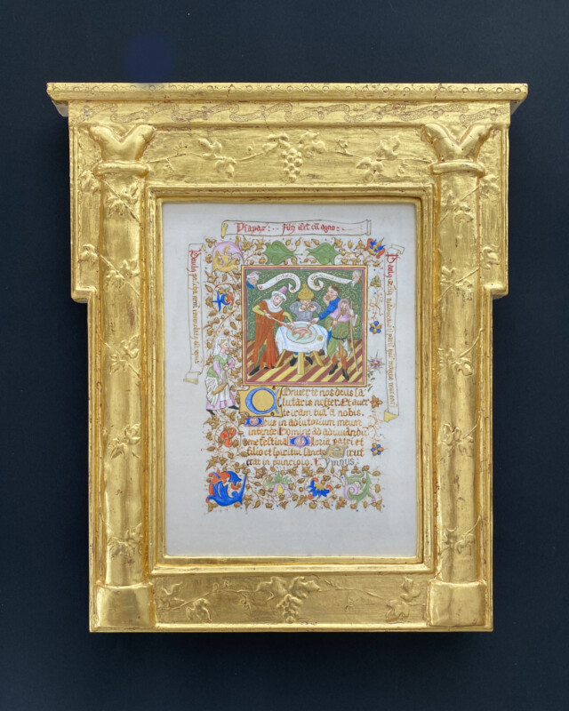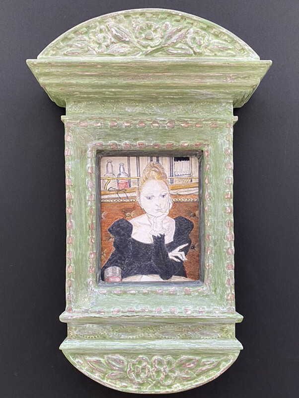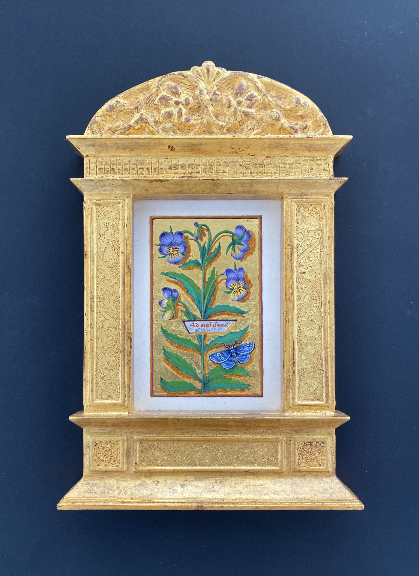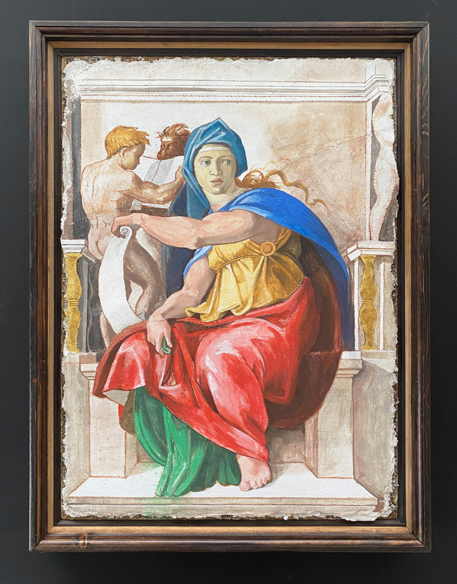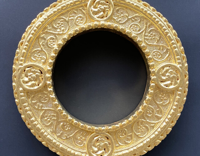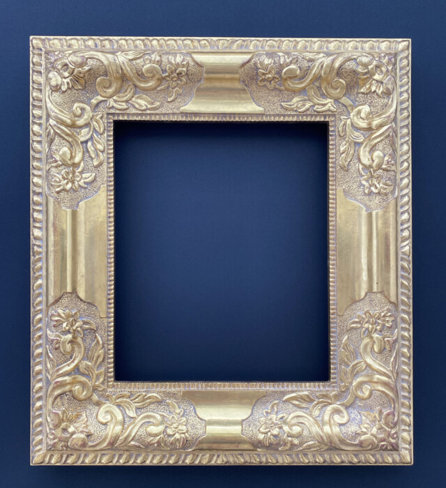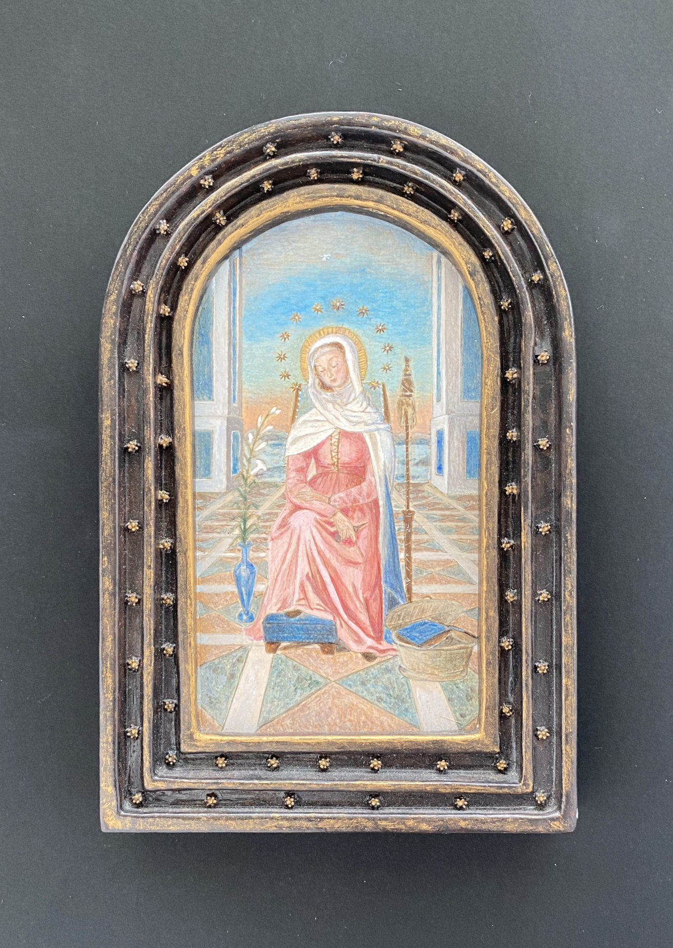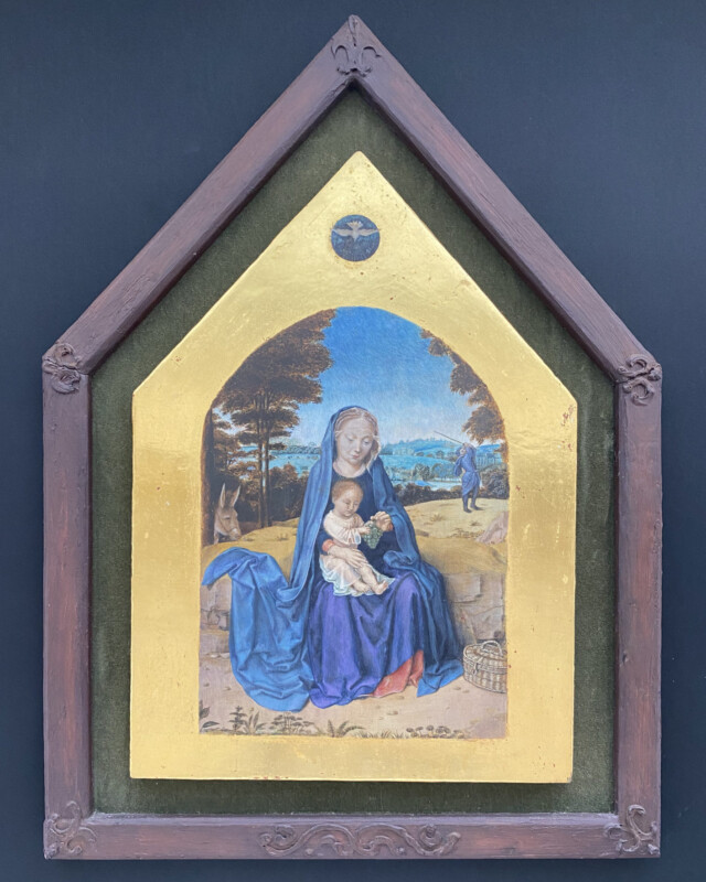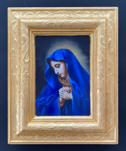 アトリエで学んだ様々な古典技法の中から今回は一番好きなパスティーリアで制作しました。石膏液を乗せる面がS字カーブになっているので下図のスクロールからはみ出したり流れ出したりしないように気を付けました。仕上げのワックスを塗る前に全体にパンチングを入れたことでスクロール模様が引き立たったと思います。額の中に入る絵は、額の金と補色関係になる青がメインの絵が良いと思いこの作品を選びました。所蔵先の国立西洋美術館ではこの作品で使用されている顔料を取材し実物の青に近づけるように試行錯誤しながら描きました。