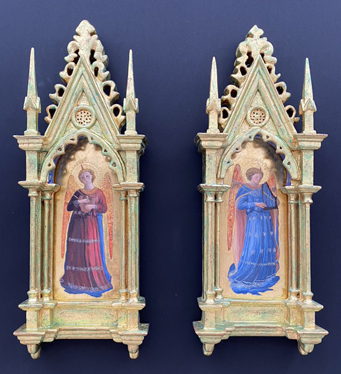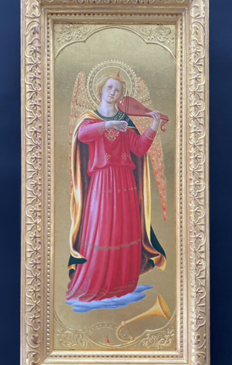 Fra Angelico(1400頃~1455年)のリナイウォーリ祭壇画(1433年)より奏楽の天使を一体ずつ模写しています。教科書替わりに挑戦していますが、何体描いても新鮮な感動があります。 他にもオリジナルの作品も描き進めていて、今回は15世紀末に制作されたタペストリーに取材した一角獣をテンペラ作品にしてみました。この時代の作品は同時期の日本のやまと絵にも通じる発色の美しさや繊細さがあり、とても魅力を感じます。アトリエでは板絵を描いてはそれに合う額縁を指導して頂くのを楽しみに制作しています。