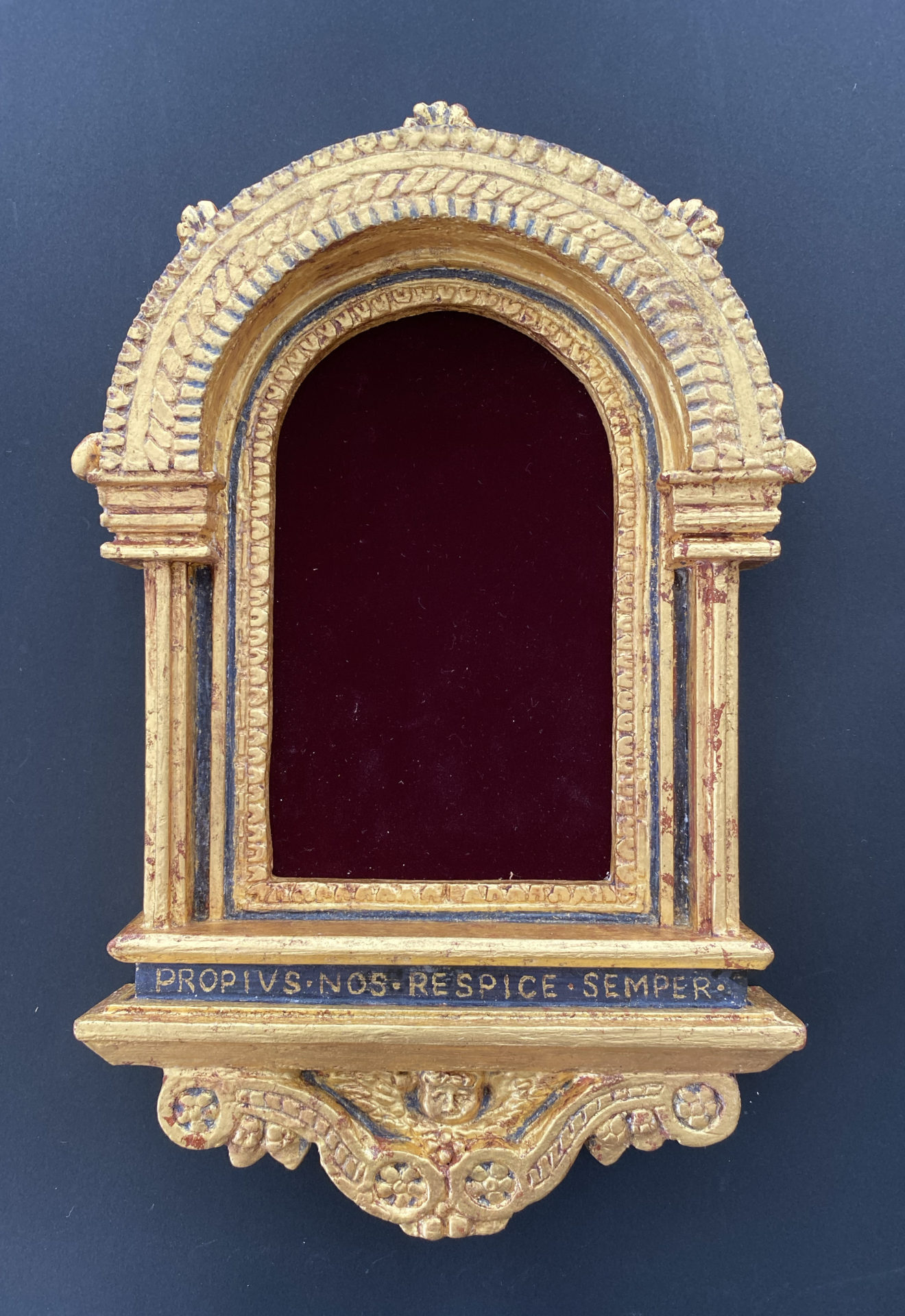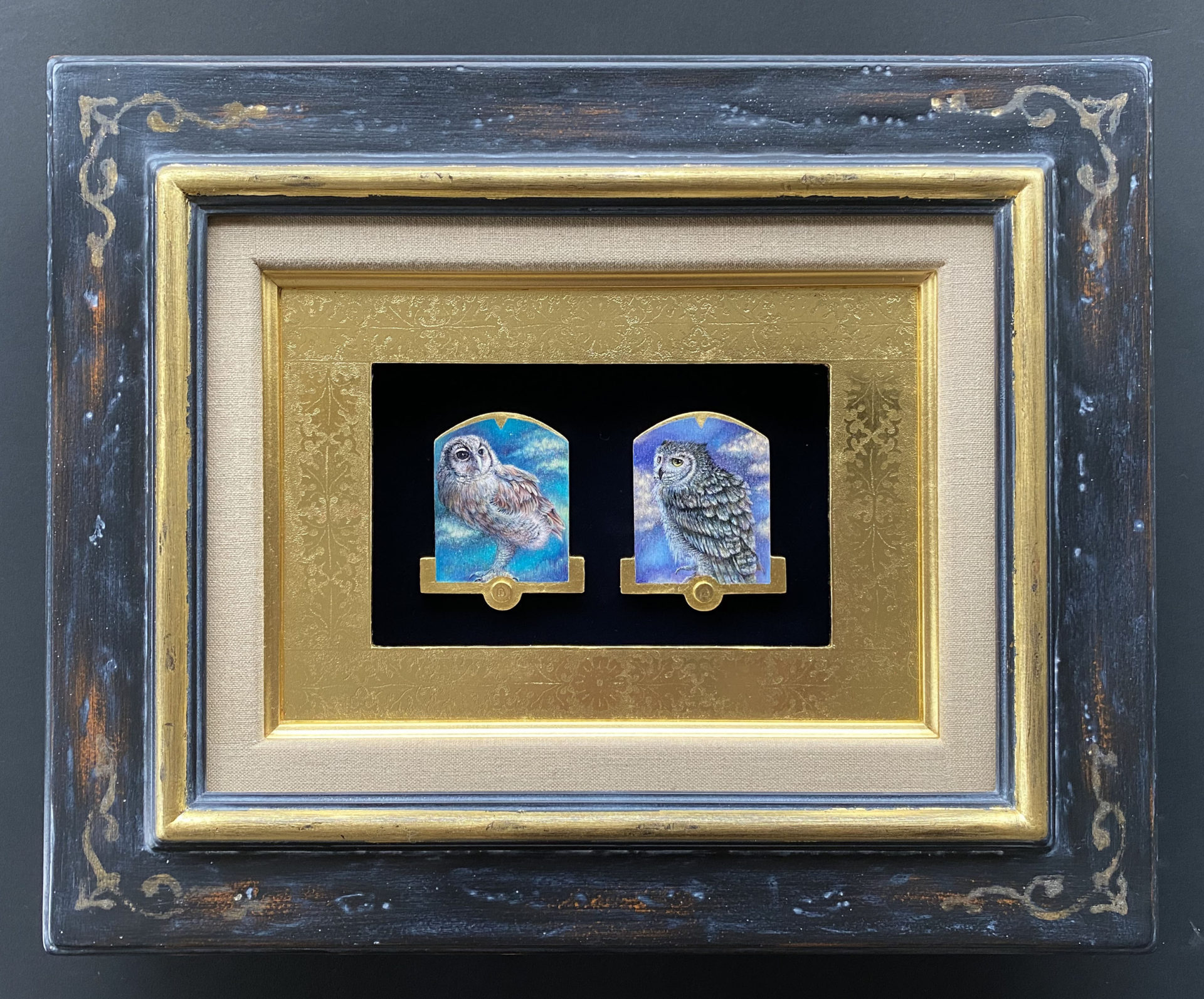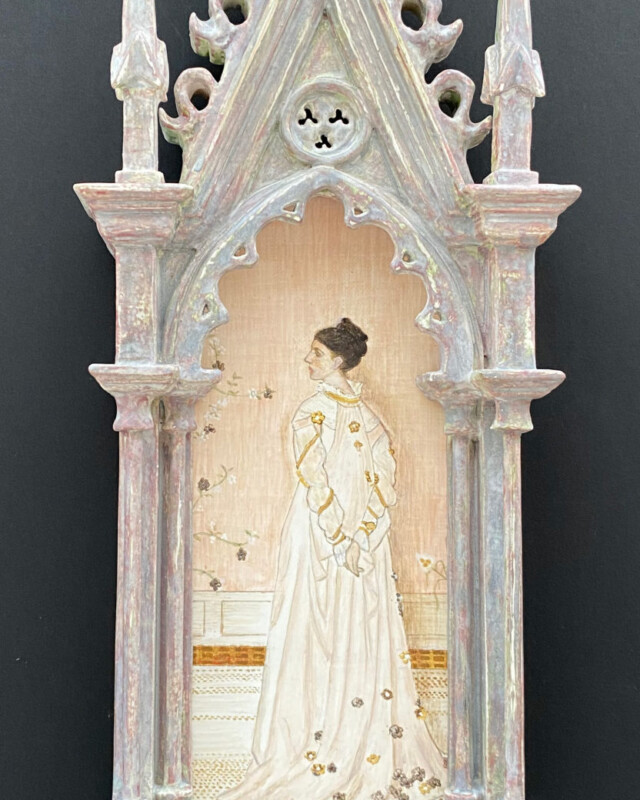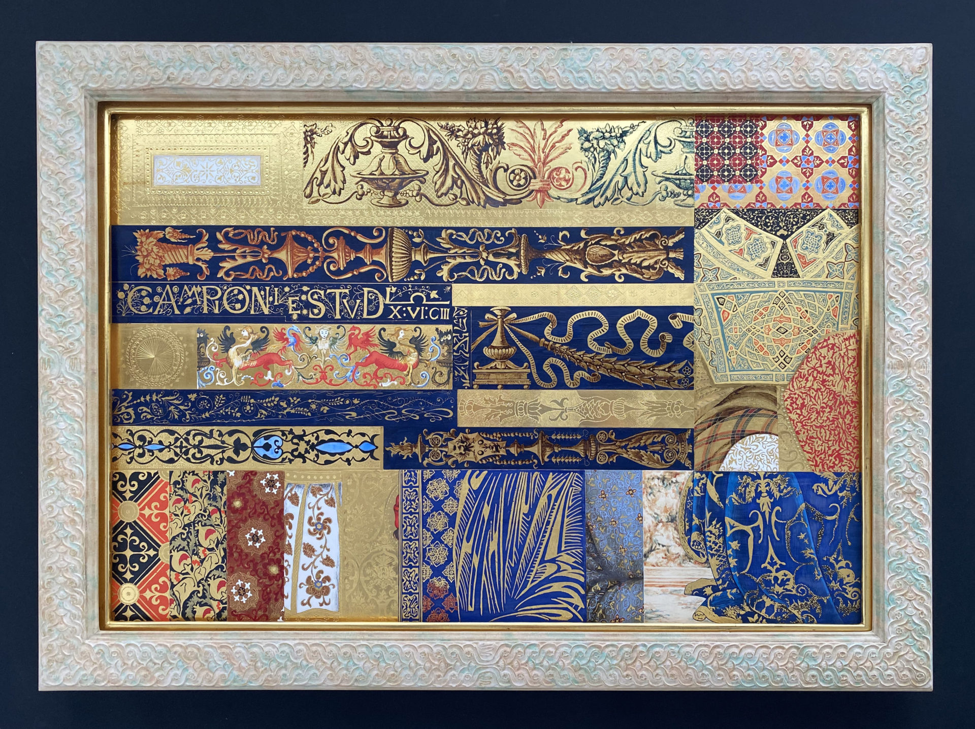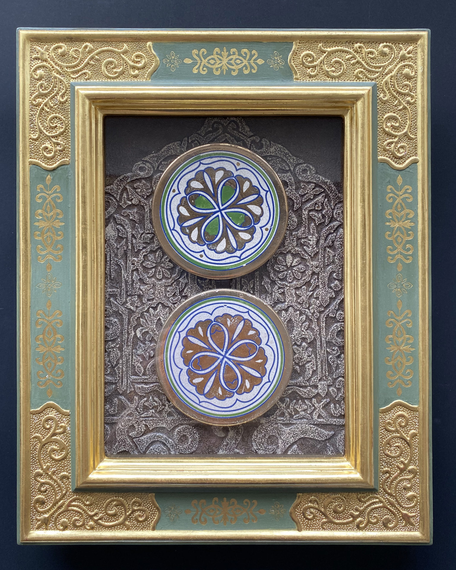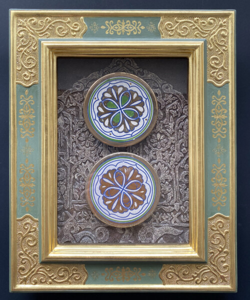西洋の古典技法による額縁制作を学びたいと思いアトリエに通い始めて、最初に作った作品です。荘厳なキリスト教美術を飾るために、宗教的な調和を考えて作られた美しい装飾の額縁を再現していくことは、楽しさと緊張感を伴いました。中の絵皿は以前アルハンブラ宮殿のそばで買ったもので、制作中にふと思い出して置いてみたら、イスラム教のアラベスク模様と額縁の装飾に思いもよらない調和が生まれました。背景には宮殿の壁の模様を切り絵で表現し、中世から継承され影響しあってきた二つの宗教美術に畏敬の念を抱きながら作りました。