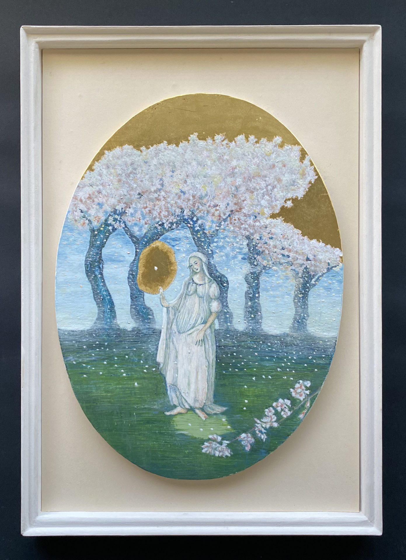 一枚の花びらにとり憑かれた一瞬を絵にしました。木漏れ日の中、はらりと落ちていく花びらは神々しく心が洗われる美しさでした。絵のイメージが仕上がるように、教室で写真を用意して頂き、金箔で光を表現することをポイントにして、苦心して仕上げた時の喜びは大きかったです。イメージ通り仕上がったのは、テンペラ画の技法によるものだと思います。これからも一枚の花びらの表現を追求していきたいです。