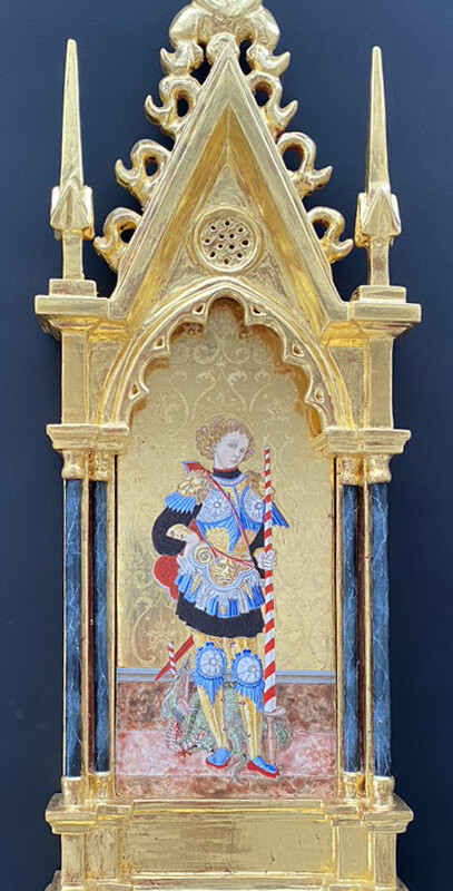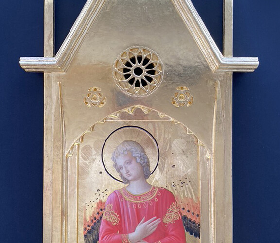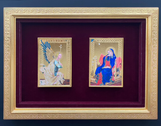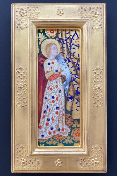 古典絵画技法の中でも、特にジェンティーレ・ダ・ファブリアーノの装飾性に魅せられ、「聖母戴冠」を模写しました(展示作品は部分)。パスティーリャ、グラフィート、刻印などの様々な技法が使われ、この模写からテンペラ画は油彩画のような立体表現ではなく、レリーフのような表現をするという事も学びました。LAPISでは、額縁の制作を通して、エイジングの技法を学ぶことができ、表現の幅が広がりました。