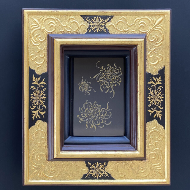 菊を「菊文様」と「乱れ菊」という対照的な描き方で表現しました。花と葉が文様化されている「菊文様」をグラッフィートした額と手彫りガラスの絵です。ガラス絵は咲き乱れる「乱れ菊」を手彫りして着色、誇張ぎみでも感性の赴くまま自由に花びらを遊ばせました。これからも『額と絵で表現する作品』を創っていきたいと思います。