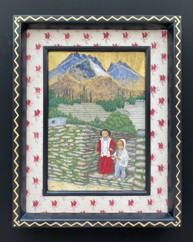 35年前にフランスの書店で、「ベリー公のいとも豪華なる時祷書」に描かれた、ラピス・ラズリ・ブルーの、余りの美しさに目を奪われました。その後英国、フランスでも少し勉強しましたが、日本の気候の中で勉強したいと思った時にAtelier Lapisにたどり着きました。今回はクリスマスのクライマックスシーンによく取り上げられる”Magi”を題材にしました。英国で購入したヴェラムに、卵黄テンペラ絵具で描き、細かい金の装飾はgesso(ジェッソ)の上に金箔を貼り、インクはセピア.ブラックを使用しています。