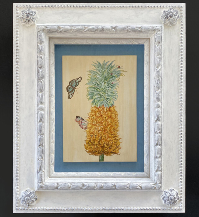 17世紀の画家であり、昆虫学者であるマリア・シビラ・メーリアンの美しいパイナップルの絵をテンペラで模写し、フレンチシャビー風の額に合わせてみました。軽やかな印象の彼女の絵に合うよう、背景も空色を選び全体的に明るい色合いで仕上げました。オリジナルの色彩には全く及びませんが、楽しい制作の時間が持てました。