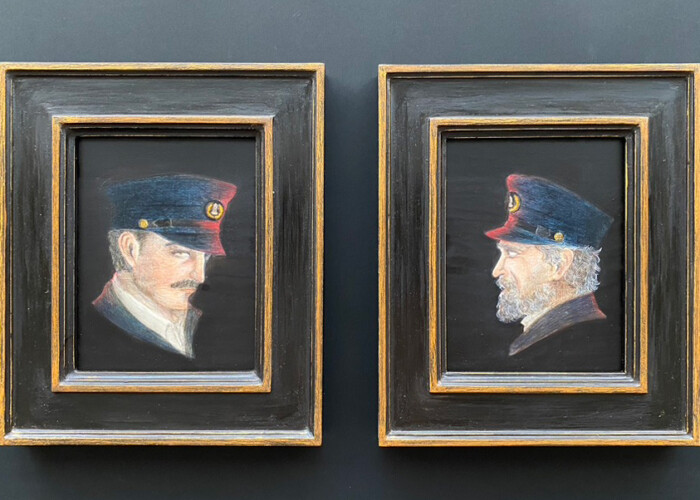 《時祷書(模写)》は16世紀初頭にMaster of Claude de France (Maître de Claude de France)が製作したといわれる作品の模写に、植物の装飾をあしらった金縁を合わせたものです。画面中央の文字はラテン語で「朝課」を意味すると思われます。《二人の灯台守》は映画『ライトハウス』(2019年)の主人公を描いたもので、19世紀末のニューイングランドの孤島を舞台に、二人きりの灯台守が負う過酷な任務と対話で構成されるモノクロ映画です。時を経る毎に狂気を孕んでゆく二人の関係性を表現しました。