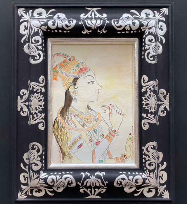 絵はインドの1728年のミニチュアの水彩模写です。銀箔装飾による額縁は18世紀前半のベニシアンフレームです。絵の人物は北インドのムガール皇帝ジャハーンギールの妻で、権威があったヌール・ジャハーンを表しています。彼女は1577年カンダハル(現代のアフガニスタン)で生まれ、1645年ラホール(現代のパキスタン)に亡くなりました。18世紀のヨーロッパではインドのミニチュアは人気があったので、額縁と絵の東洋と西洋の組み合わせを選びました。