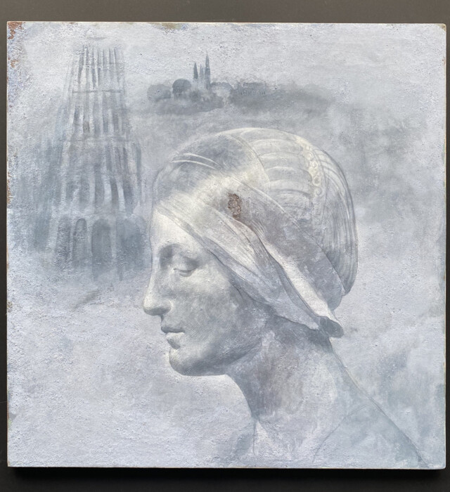 私は『Atelier LAPIS』にフレスコ画・黄金テンペラ画・羊皮紙の写本などの技法、すなわち、古典絵画の支持体・各種地塗り・描画法・媒介などの材料技法の研究をしています。今回のオリジナル展示作品は、水・油共に溶けやすいカゼイン・メディウムを使い、水性絵具と油性絵具の二重の役をします。その下素描においては混合技法を使いました。また、カゼインはフレスコ画の最上層にもよく使われ、質感の幅が広がります。