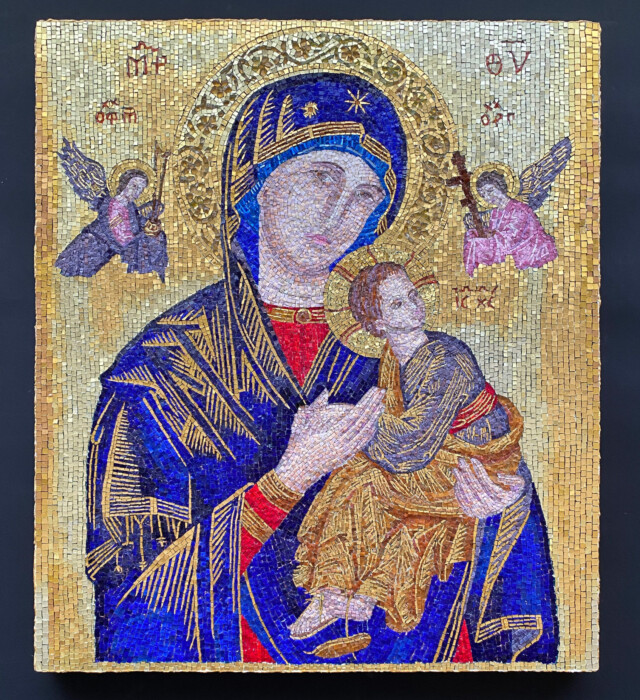 「絶えざる御助けの聖母」は16世紀にクレタ島で発見された無名画家の作品で、格式の高さから多くの人が信仰の対象としました。一時、宝冠を付けられましたが現在では外され、レデンプトール修道院が厳重に保管しています。「親指のマリア」悲しみのマリアともいわれ、18世紀カルロ・ドルチによる制作で、評判を呼び多くの模写、バージョンが描かれました。このモザイクはイタリアベニスのオルソニー社のズマルトガラスを使っています。色数が多く細かいカットに向き、セメントに混和材を混ぜ直貼りで制作しました。